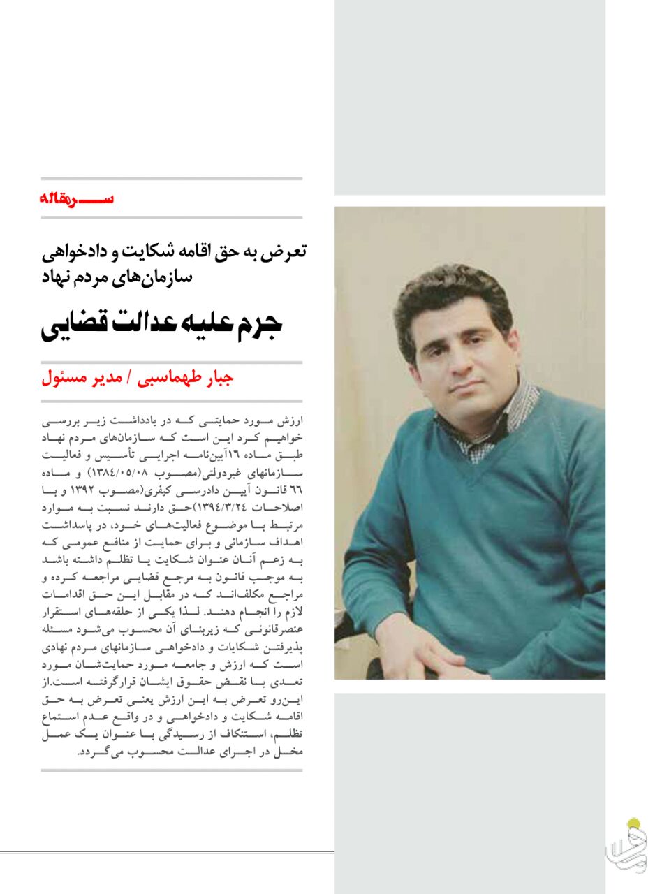 ![]() سرمقاله جرم علیه عدالت قضایی(تعرض به حق اقامه شکایت و دادخواهی سازمانهای مردم نهاد) به قلم جبار طهماسبی را در شماره ۲ نشریه ماف بخوانید