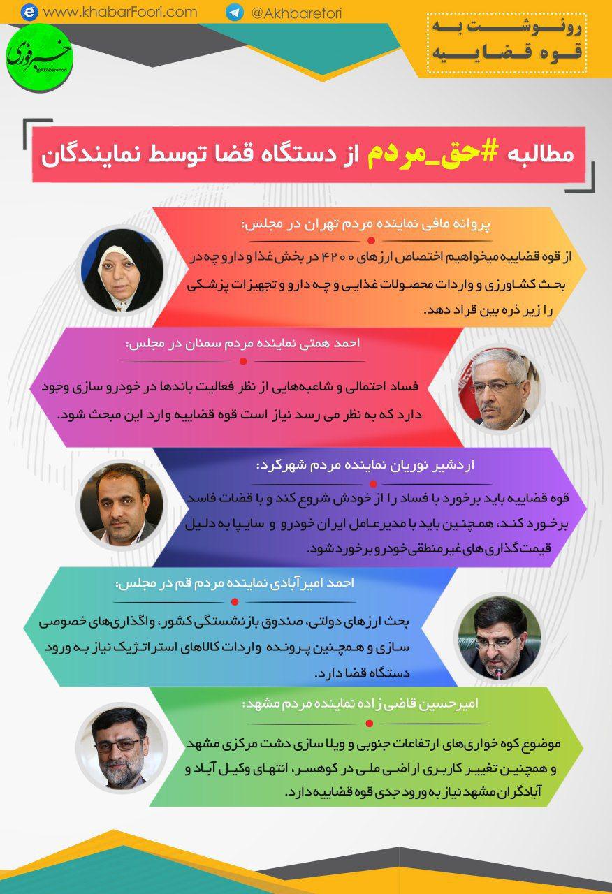 🔹پس از اینکه رئیس قوه قضائیه خواست تا مردم و مسئولین از فساد خبر دهند، نمایندگان مجلس شورای اسلامی در گفتگو با خبرفوری، خواستار ورود و برخورد قوه قضاییه با قضات فاسد، ورود به پروندههای کوهخواری در مشهد، بررسی فساد در شرکتهای خودروسازی و… شدند.