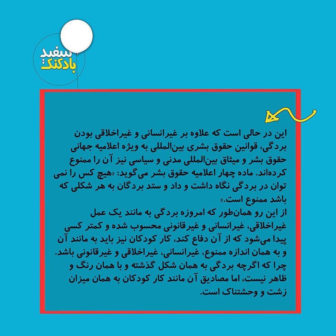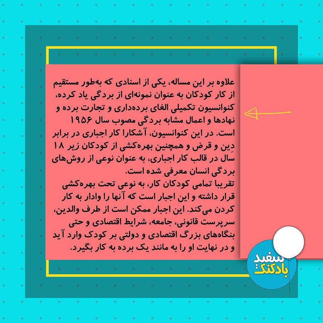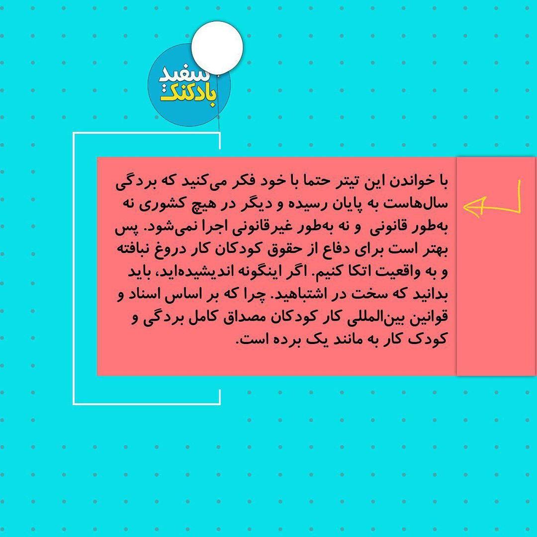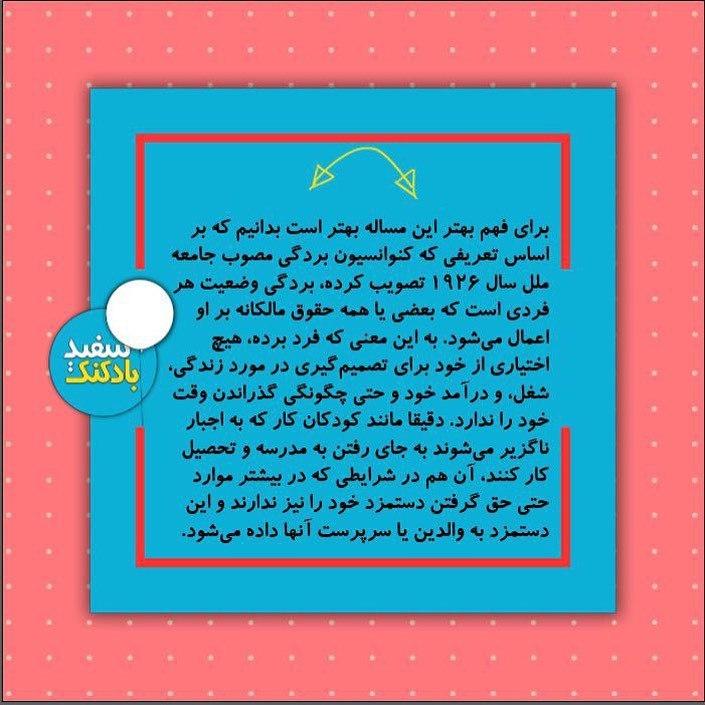 🔻با خواندن این تیتر حتما با خود فکر میکنید که بردگی سالهاست به پایان رسیده و دیگر در هیچ کشوری نه بهطور قانونی و نه بهطور غیرقانونی اجرا نمیشود. پس بهتر است برای دفاع از حقوق کودکان کار دروغ نبافته و به واقعیت اتکا کنیم. اگر اینگونه اندیشیدهاید، باید بدانید که سخت در اشتباهید. چرا که بر اساس اسناد و قوانین بینالمللی کار کودکان مصداق کامل بردگی و کودک کار به مانند یک برده است.