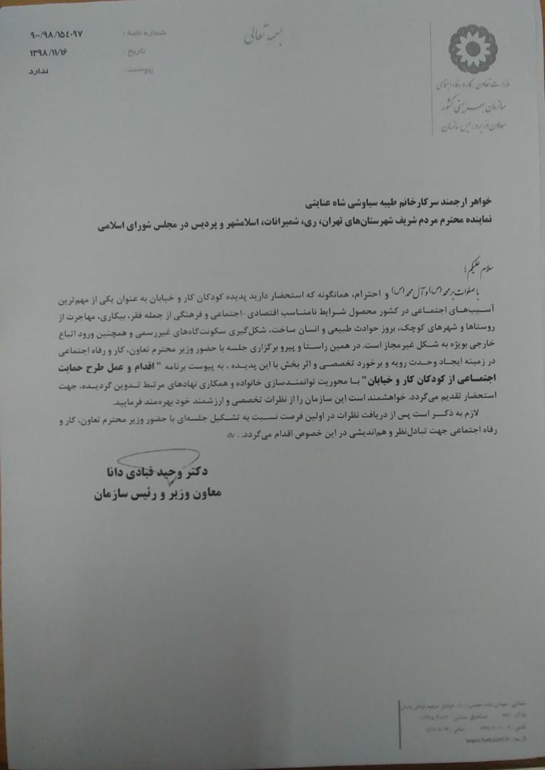 ✔️ قبادیدانا در این نامه، پیوستی از برنامهی «اقدام و عمل طرح حمایت اجتماعی از کودکان کار و خیابان» با محوریت توانمندسازی خانواده و همکاری نهادهای مرتبط ارسال نموده و پس از دریافت نظرات، وعده داده است نشستی با وزیر تعاون، کار و رفاه اجتماعی در این خصوص انجام شود.